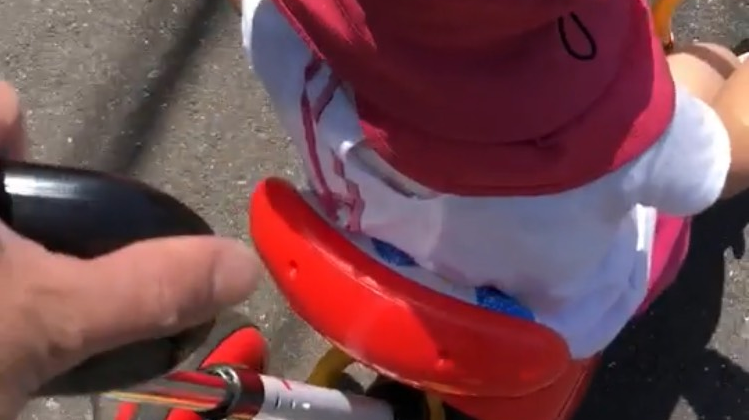 そこで活躍したのが、ペダルが空回りする機能が付いた三輪車です。足をペダルに乗せてキコキコと空回りでも「漕いでいる」感覚を体感させながら、後ろの補助バーで押してあげました。この「漕いでいるふり」の期間が功を奏し、、