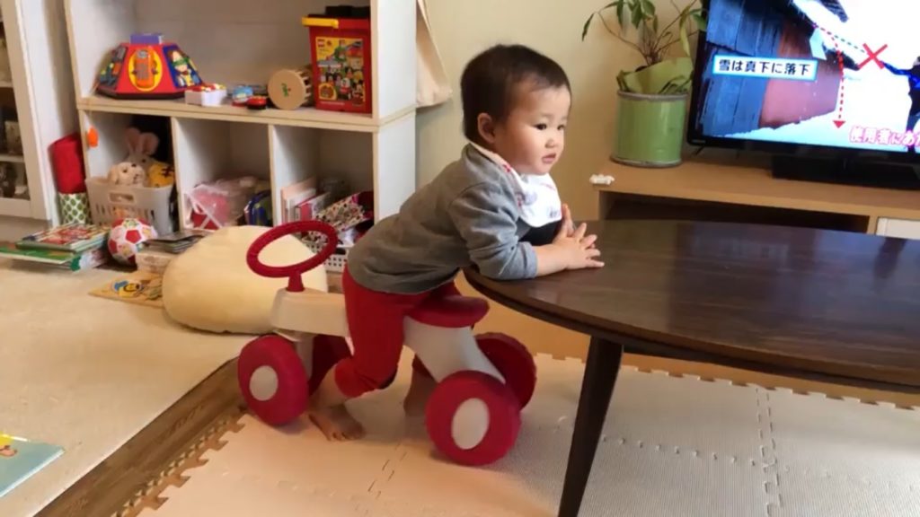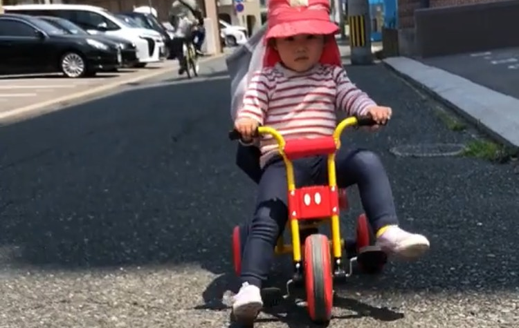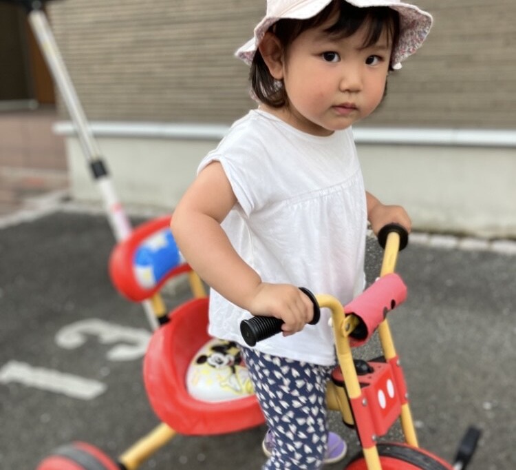 2歳8ヶ月の初め、三輪車に乗せてみましたが、最初はペダルを漕ぐという概念がありませんでした。