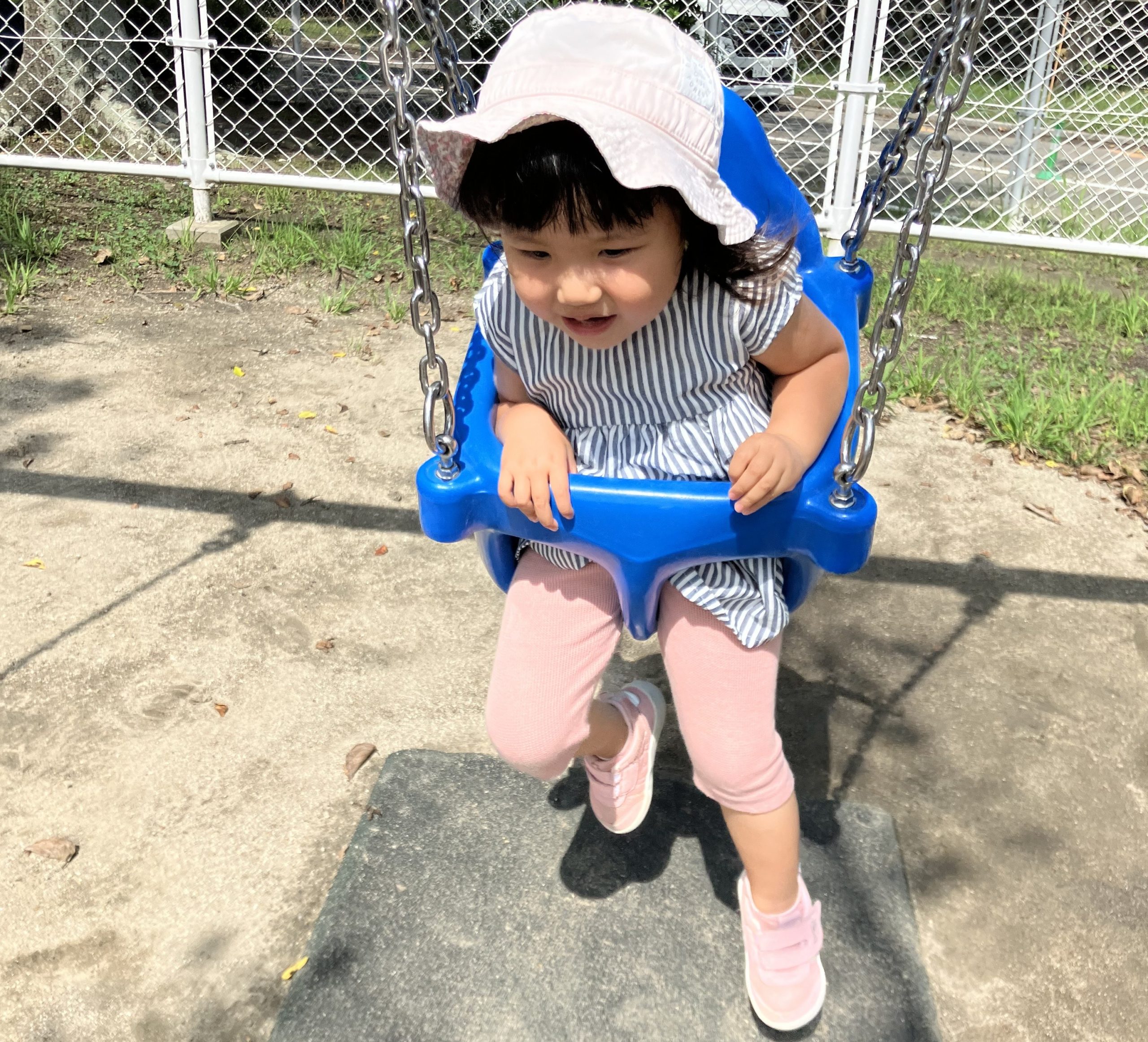 通常のブランコに慣れてきたら、自分で勢いをつける「漕ぐ」動作に挑戦です。